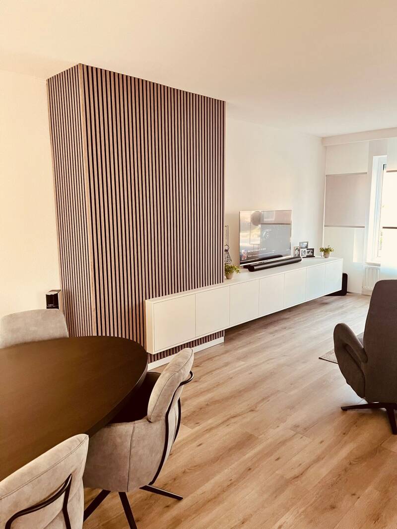 Vorige week wederom een mooi project afgesloten. Deze achterwand is voorzien van 10 led spots welke naar wens kunnen worden gedimd. Tevens is er met 4 greeploze kasten voldoende opbergruimte gecreërd. Het achterwandpaneel van de televisie is uitgevoerd in gefineerd eiken. Het overige gedeelte van de achterwand kast is uitgevoerd in gelakt (ral 9010) mdf (dikte 6,5 cm). Afmetingen van de totale achterwand kast is: 350 cm breedte / 235 cm hoogte / 40 cm diepte